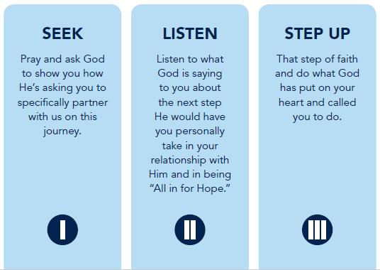 We are excited to take this next step together, and we would love for you to join us in being “All In For Hope” by doing these 3 things: