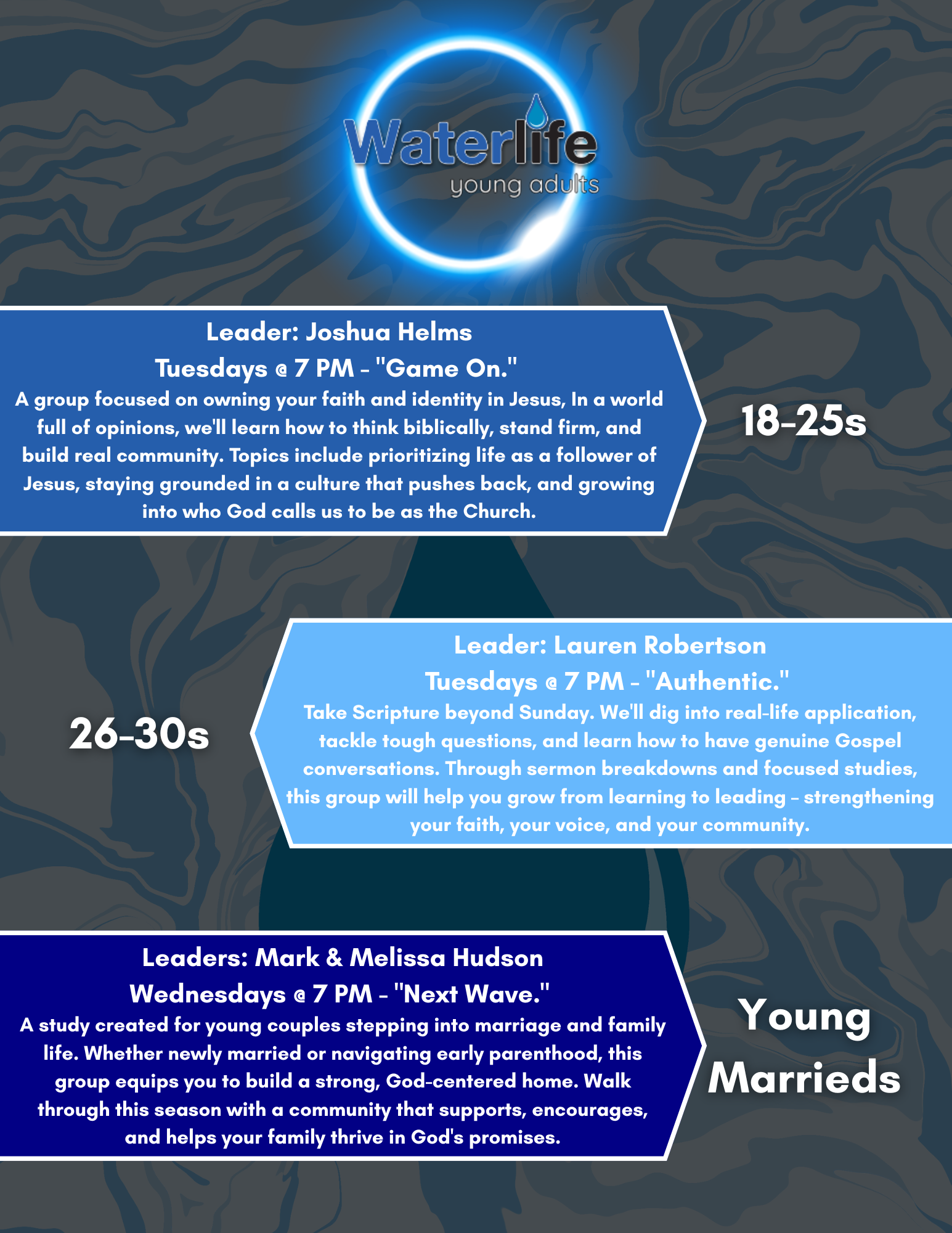 Life in your twenties is full of transitions, different life stages, and maybe more questions than answers. That's where Waterlife Young Adults step in! This ministry was created to help those of ages 18-30 to navigate life, all while building genuine community, becoming leaders that stand boldly in truth, and growing a lasting faith in Christ.